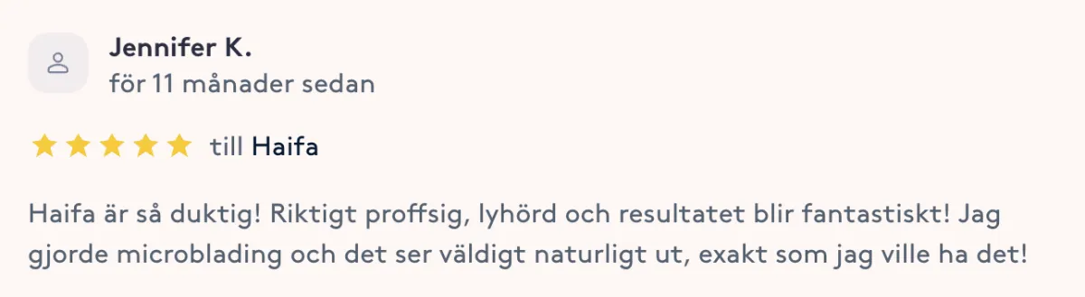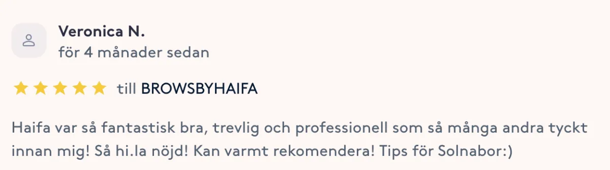 Välkommen till BROWS BY HAIFA, din destination för skönhetsbehandlingar av högsta kvalitet i Sundbyberg. Jag, Haifa, driver företaget och är en certifierad expert inom kosmetisk tatuering, tatueringsborttagning samt lash och browlift. Med en passion för skönhet och precision har jag dedikerat min karriär till att hjälpa mina kunder att framhäva sin naturliga skönhet och skapa resultat som verkligen varar.