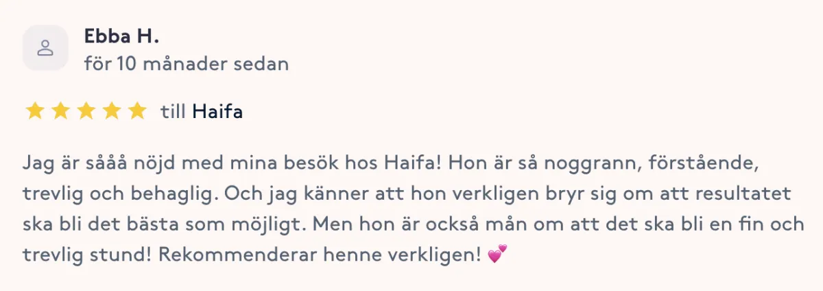 Med noggrannhet, yrkesskicklighet och en stark känsla för detaljer strävar jag alltid efter att leverera behandlingar som är skräddarsydda efter varje kunds unika behov och önskemål. Jag arbetar endast med kvalitetsprodukter och moderna tekniker för att säkerställa att varje behandling är säker, effektiv och av högsta standard.